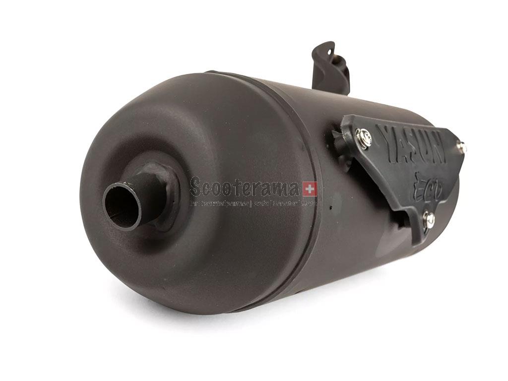 Unauffälliger, hochwertiger Ersatz- resp. Touring-Auspuff welcher euren originalen Roller mit Piaggio Motor optisch aufwertet. Der matt schwarz lackierte Auspuff ist mit einem auf hochglanz polierten Edelstahl-Hitzeblech mit eingestanztem "Yasuni ECO" Logo versehen. Auf dem Auspuff selbst ist die E-Nummer eingeprägt. Die Anlage ist durch einen **Trichter im Krümmer und/oder durch ein **aufgeschweißtes Reduzierstück am Ende gedrosselt.