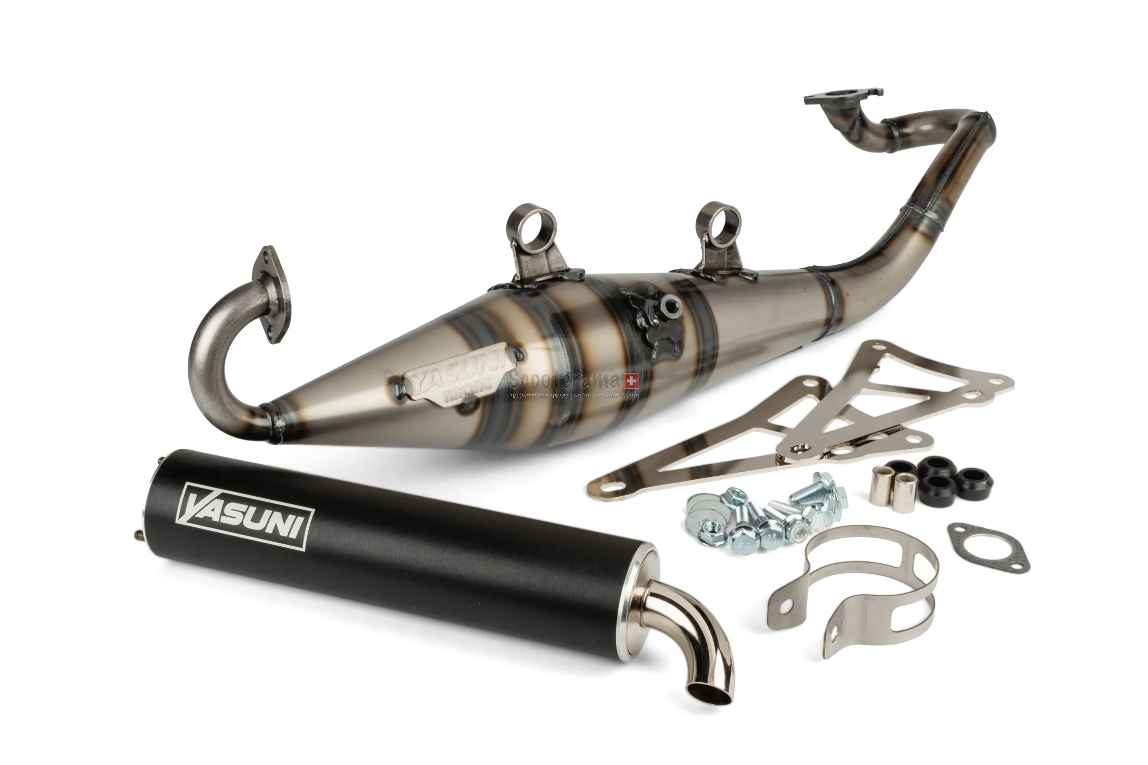 Die Scooter "Z" vom spanischen Hersteller YASUNI ist eine wirklich leistungsstarke Racinganlage in Verbindung mit 50-ccm- und 70-ccm- Sportzylindern. Ähnliche Leistungscharakteristik wie die Hebo Performer oder Polini Funky. Ausgerüstet ist die "Z" mit einem schwarzen Aluminium-Enddämpfer. Fetter Sound und gute Leistung.