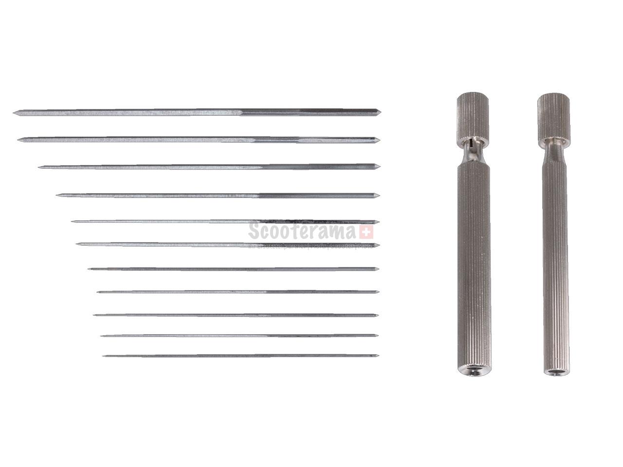 Der 12-teilige Düsen-Reibahlen-Satz wird zum Reinigen von Düsen eingesetzt. Der Satz besteht aus zwei Werkzeughaltern und elf Reibahlen mit unterschiedlichen Durchmessern im Bereich von 0,6 bis 1,9 mm.