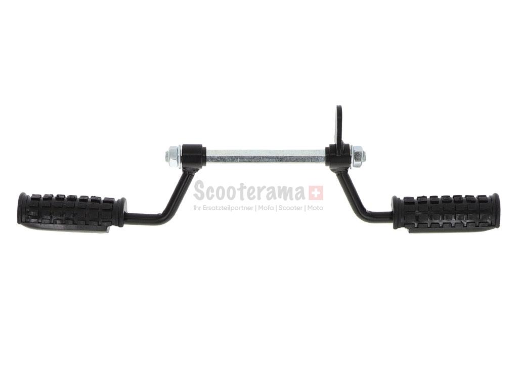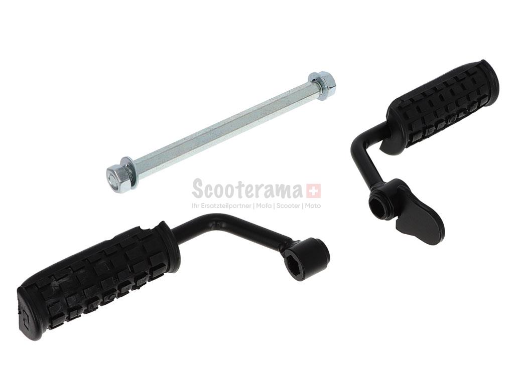 Das Fussraster-Set für Puch Maxi überzeugt durch seine einfache Montage und hochwertige Verarbeitung.  Dank der durchdachten Konstruktion ist es nicht mehr nötig, selbst eine Gewindestange in die Pedalaufnahme einzusetzen. Einfach die mitgelieferte Achse in die Pedalachsenaufn...