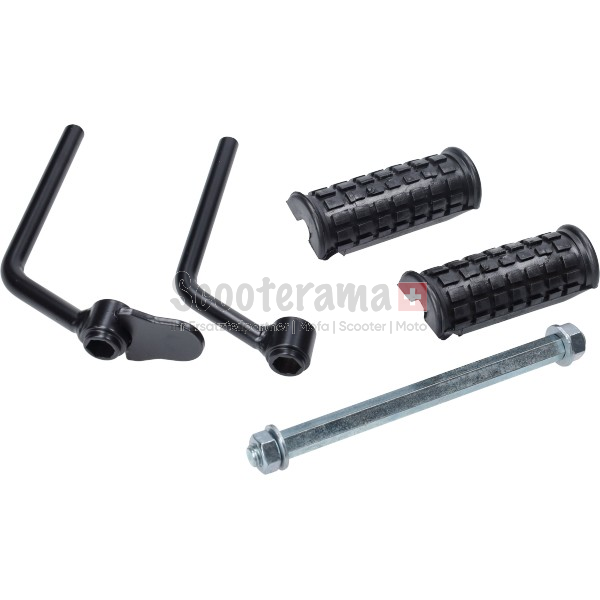 Fussrasterset passend für Puch Maxi. Das Geniale daran ist, dass man nun nicht mehr selbst eine Gewindestange in die Pedalaufnahme im Rahmen einsetzen muss. Einfach die mitgelieferte Stange in die Pedalachsenaufnahme stecken und dann links und recht die Rasteraufnahmen aufstecken und mit d...
