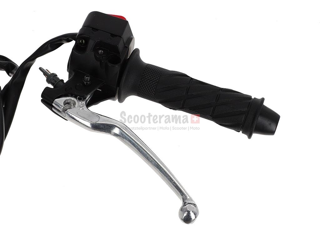 Bremsgriff für die neueren Tomos Sprint, Quadro und Fun-Sport mit der neuen Gabel (Schalter und Griffeinheit sind kombiniert) Bedienelement hat die Knopf für die Hupe, Blinker und Licht, inklusiv ein montierter Bremslichtschalter. Ø Lenker: 22 mm ...