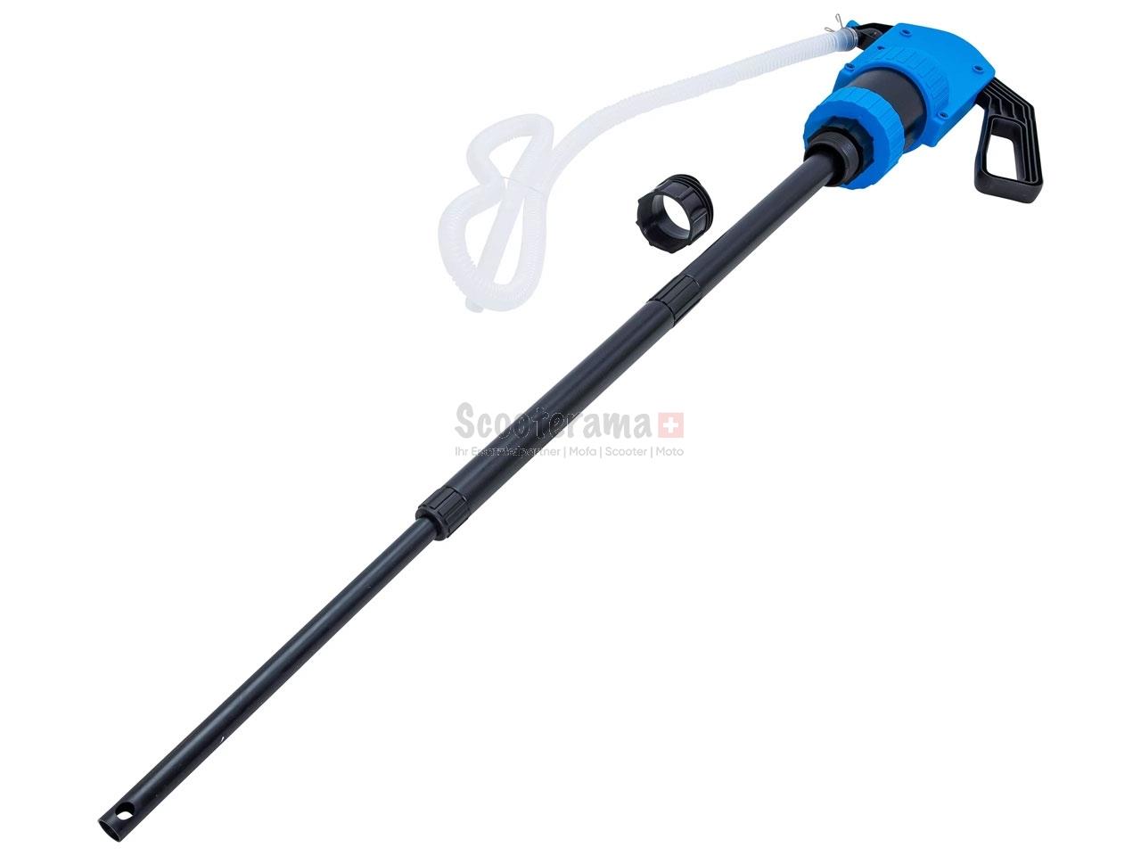 Die Pumpe fördert pro Hub 0,5 Liter und erreicht einen Durchfluss von bis zu 20 Litern pro Minute. Das steckbare Saugrohr lässt sich von 350 bis 980 mm anpassen und passt damit auf unterschiedliche Fassgrössen. Ein 2 Meter langer Förderschlauch gehört ebenfalls zum Lieferumfang.