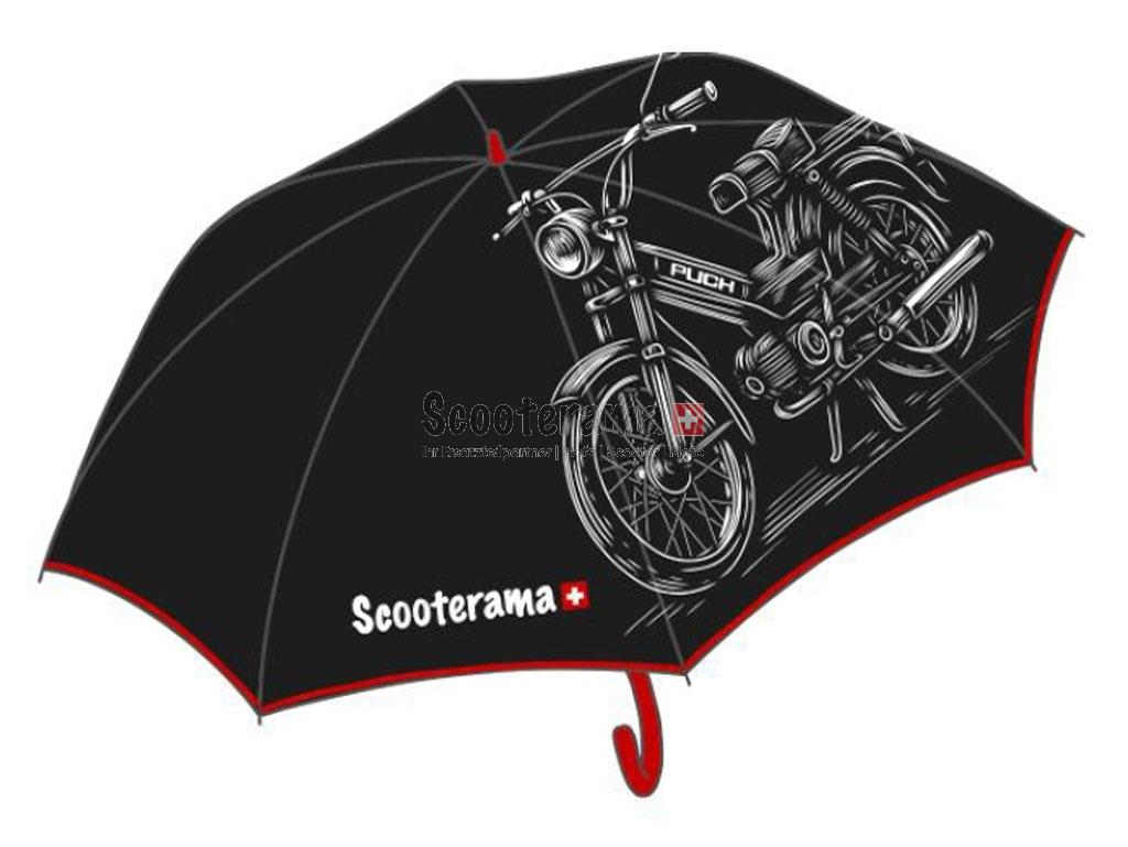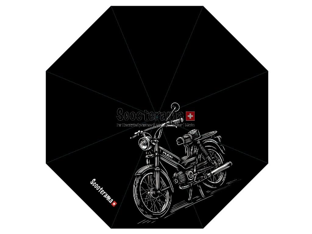 Der Parapluie ist schwarz, mit rotem Henkel und einem weissen Logo resp. Mofa Motiv.