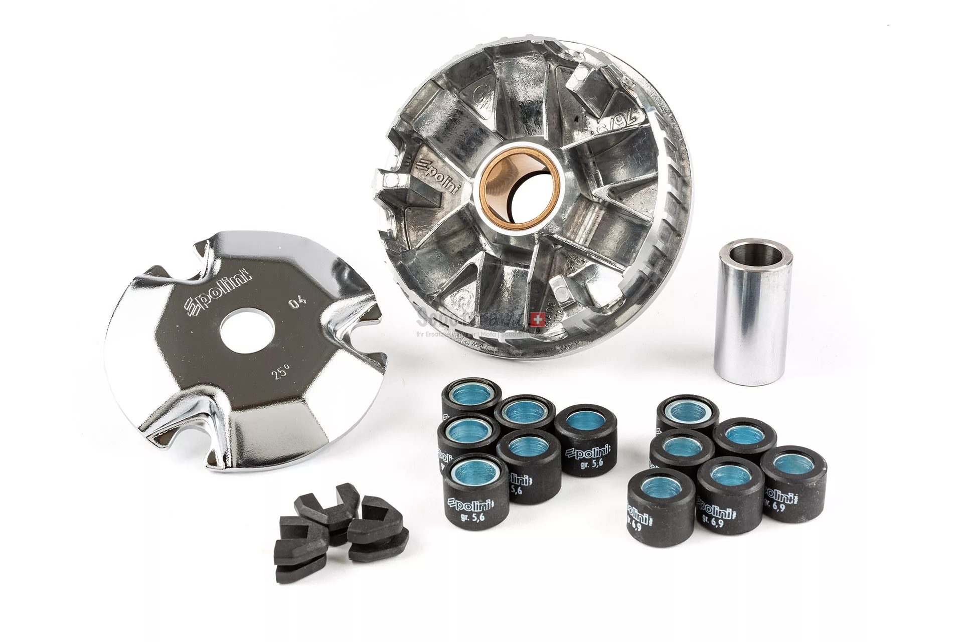 Polinis neueste Entwicklung für 50-cc-Motoren sind die HI-SPEED-Variatoren. Die Variatoren überzeugen durch hohe Qualität sowie Optimierung der Laufbahnen. Je nach Variante liegt dem Kit eine Gegendruckfeder bei, die ein Durchrutschen des Keilriemens verhindert und der besseren Kraftübertragung dient. Der Clou daran ist, dass Polini mit der Evo-Slider, einer Art Führungsscheibe für die Gegendruckfeder, dem Verdrehen der Feder entgegenwirkt. Je nach Variante erhaltet ihr zudem auch einen Satz stärkere Kupplungsfedern, mit denen die Kupplung aufgrund des erweiterten Schaltbereiches der Variomatik später einkuppelt.
