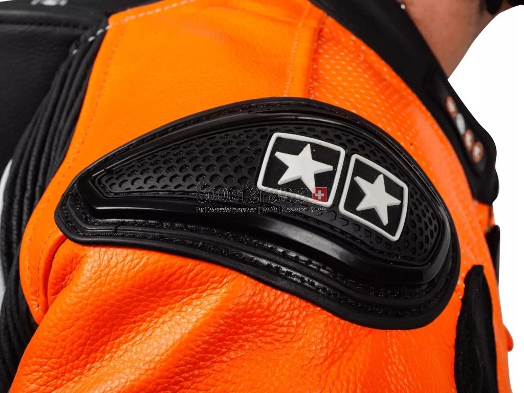 La nouvelle version en cuir de vachette de 1,3 mm d'épaisseur offre une protection complète avec des protections certifiées CE aux zones les plus exposées.
