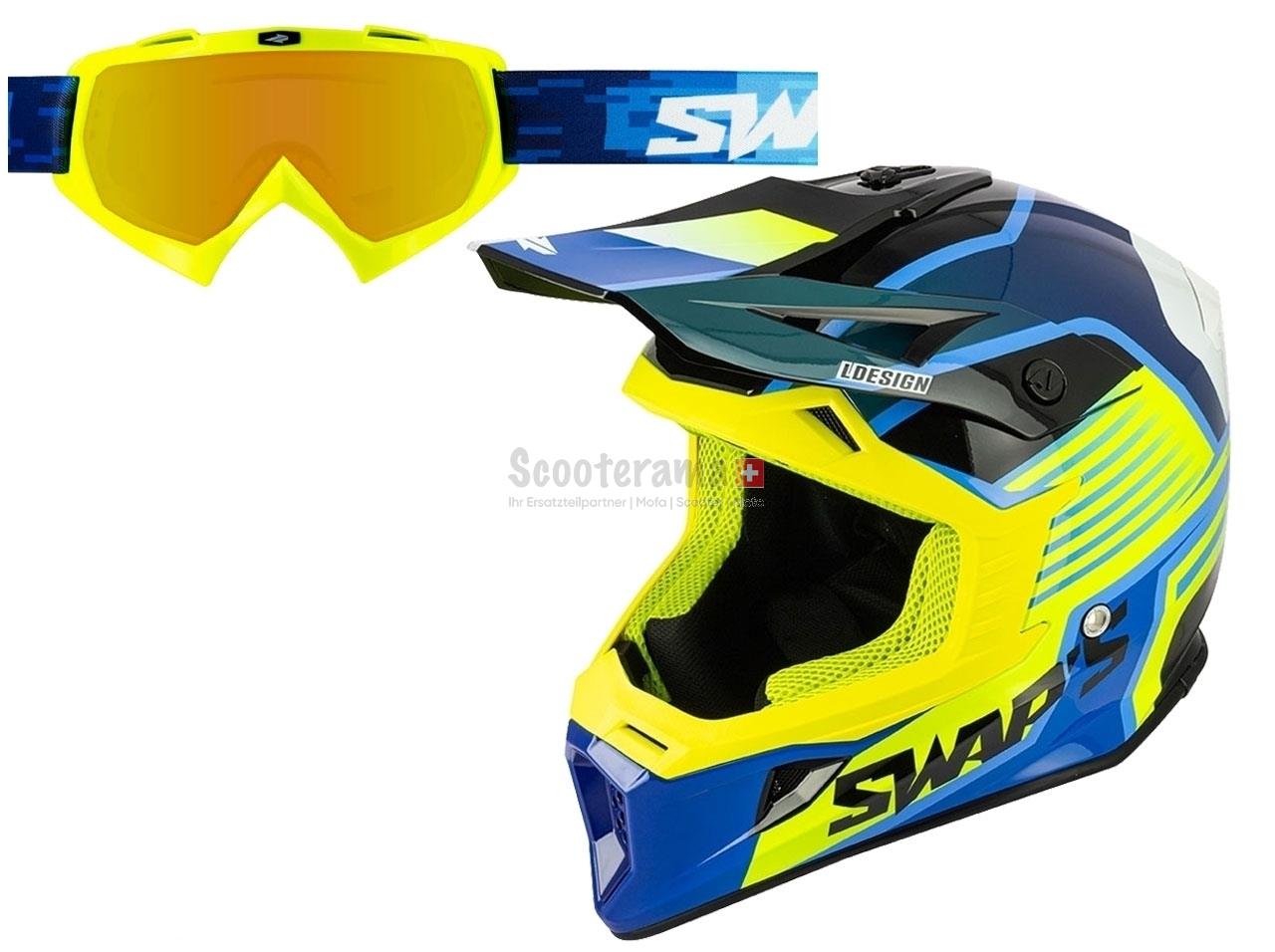 Kit casque cross SWAPS S818 Blur + lunette (bleu / jaune), taille : M