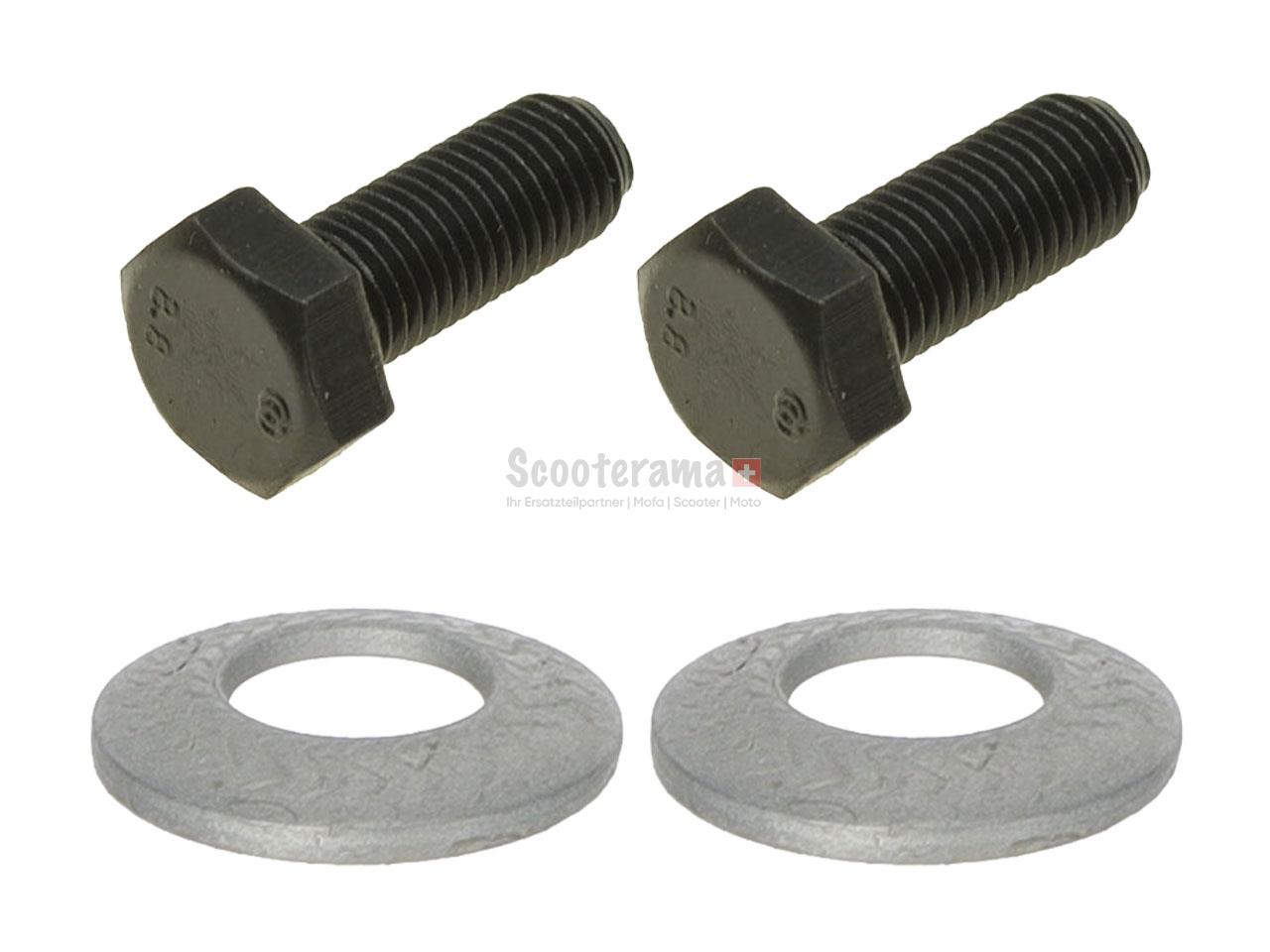 Jeu de vis comprenant toutes les petites pièces (deux vis MF8x1 et deux rondelles) nécessaires au montage de l'axe de pédalier sur votre Pony GTX, Pony Cross 521.